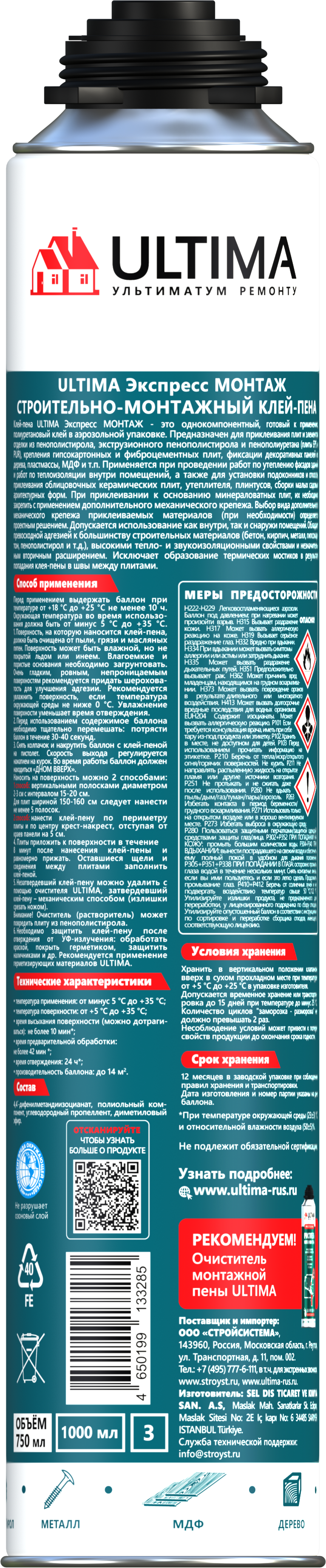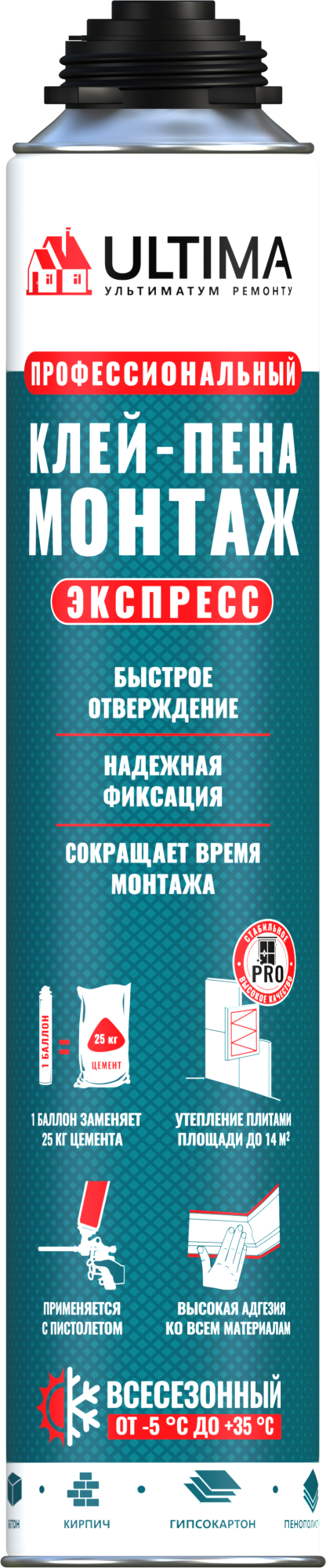 Клей-пена ULTIMA Экспресс Монтаж - это однокомпонентный, готовый к применению, полиуретановый клей в аэрозольной упаковке. Предназначен для приклеивания плит и элементов отделки из пенополистирола, экструзионного пенополистирола и пенополиуретана (плиты EPS и PUR), крепления гипсокартонных и фиброцементных плит, фиксации декоративных панелей из дерева, пластмассы, МДФ и т.п.