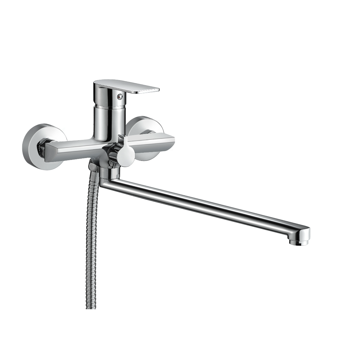 Смеситель для ванны с длинным изливом NENSA изготовлен из высококачественной латуни. Данный смеситель имеет однозахватную конструкцию, что позволяет легко и быстро настраивать температуру и напор воды одной рукой. Корпус смесителей изготовлен из прочной и долговечной латуни, а гальваническое покрытие обеспечивает стильный внешний вид и надежную защиту от коррозии. Переключение между режимами «душ» и «ванна» осуществляется легким поворотом переключателя. Длина излива составляет 350 мм, что обеспечивает комфортное использование и достаточный радиус действия.