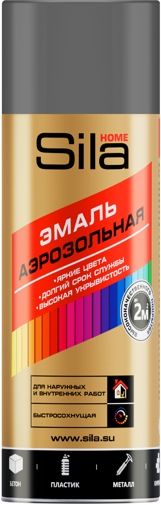 Sila HOME — быстросохнущая акриловая эмаль в аэрозольном баллончике с характерным металлическим эффектом. Подходит для наружных и внутренних работ.